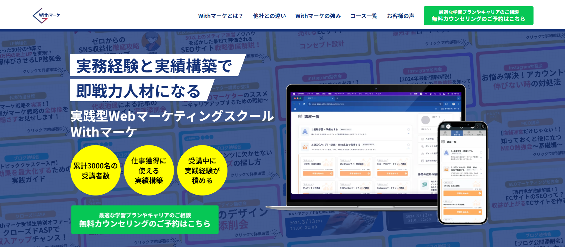 『Withマーケ』は高い評価を獲得しているWEBマーケティングスクールで、総合的なマーケティングスキルの習得が可能です。『Withマーケ』ではInstagramを学ぶことができ、6ヶ月でInstagram運用のプロを目指せるコースと2ヶ月でインスタクリエイターになれるコースがあります。